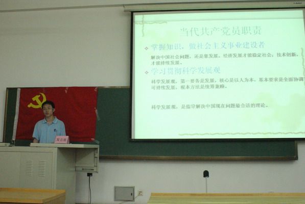 2011年9月15日18:30,化工学院 “红色讲坛”第四期在正心楼117教室成功举行。各学生党支部的党员与积极分子参加了本期讲坛,本期讲坛由贺金秋老师主持。 本次讲坛的3位演讲人分别是陈诚、赵磊、冯荣坤。演讲者结合重大人物、重大历史事件,围绕国内外热点问题、当代大学生历史使命等话题展开,声情并茂地阐述了自己的观点,并积极与在场同学互动。演讲者号召各位党员和积极分子要勇担历史重任,增强自身社会责任感,树立良好的大学生党员形象,切实发挥党员先锋模范作用。 化工学院“红色讲坛”是提高化工学院党员党性修养的重要平台之一。讲坛结合重大时间节点及重要主题,以主题演讲的形式,提高学生党员的理论水平,锻炼学生党员的思辨能力,提升学生党员争先意识,切实发挥党员先锋模范作用。