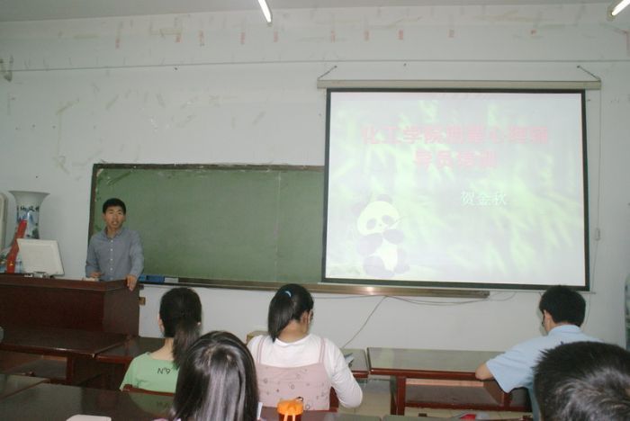 2012年5月21日中午12点30分,化工学院心理联络员、本科生辅导员贺金秋在理学楼901进行朋辈心理辅导员培训,本次培训的主题是“强化心理健康意识、逐步提高辅导能力”,化工学院全体朋辈心理辅导员参加培训。 培训伊始,贺老师通过一些有趣的心理图片引入话题,他表示,朋辈心理辅导员对保持班级同学心理健康具有重要作用,我们要及时发现问题、上报问题并解决问题。贺老师与大家共同探讨了引发心理问题的主要因素,如经济压力、学习压力、人际交往障碍和情感困扰等,并针对这些因素一一做了阐述。他希望朋辈心理辅导员多学习相关知识,不断提高发现心理问题和疏导心理问题能力,并架起老师与同学之间交流的桥梁,让全院同学都能在健康、快乐的环境中学习、生活。