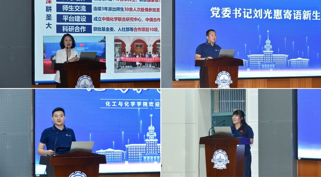 院长吴晓宏以“化学·使命·未来—在新质生产力的时代浪潮中开辟新航程”为题系统介绍学院情况,回顾学院始终与国家化学工业发展同频共振的奋斗历程,全面阐释学院面向世界科技前沿、国家重大战略和产业转型升级所构建的高水平人才培养体系,重点介绍学院在智能化学工程、高端电子化学品、新能源材料、生物医药等前沿方向的布局规划,勉励新生“以分子之微,铸世界之大”,在国际舞台发出中国青年的强音。