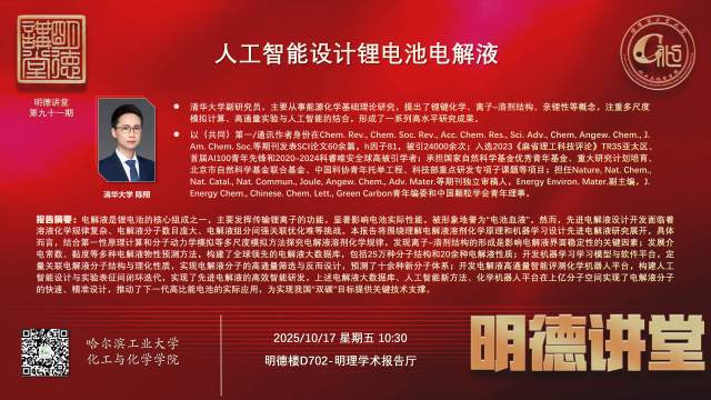陈翔,清华大学副研究员。主要从事能源化学基础理论研究,提出了锂键化学、离子–溶剂结构、亲锂性等概念,注重多尺度模拟计算、高通量实验与人工智能的结合,形成了一系列高水平研究成果。以(共同)第一/通讯作者身份在Chem. Rev., Chem. Soc. Rev., Acc. Chem. Res., Sci. Adv., Chem, Angew. Chem., J. Am. Chem. Soc.等期刊发表SCI论文60余篇,h因子81,被引24000余次;入选2023《麻省理工科技评论》TR35亚太区、首届AI100青年先锋和2020–2024科睿唯安全球高被引学者;承担国家自然科学基金优秀青年基金、重大研究计划培育、北京市自然科学基金联合基金、中国科协青年托举工程、科技部重点研发专项子课题等项目;担任Nature, Nat. Chem., Nat. Catal., Nat. Commun., Joule, Angew. Chem., Adv. Mater.等期刊独立审稿人,Energy Environ. Mater.副主编,J. Energy Chem., Chinese. Chem. Lett., Green Carbon青年编委和中国颗粒学会青年理事。