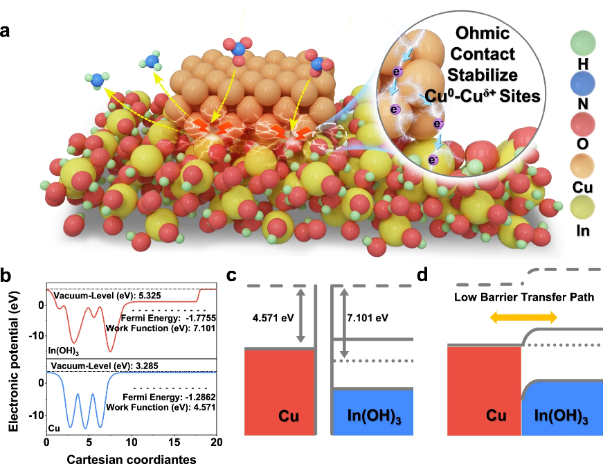 团队针对铜基催化剂在硝酸盐电还原体系中长期存在的“活性位点自还原失稳”难题,提出通过功函数差诱导电子定向迁移的界面调控思路。在构建的铜@氢氧化铟异质结构中,电子自发地由金属铜迁移至半导体氢氧化铟,形成稳定极化的Cu0–Cuδ+活性位点,从而有效抑制Cuδ+自还原,保持催化中心长期稳定。该设计不仅实现了高效电荷传输与反应动力学提升,也为金属—半导体界面电催化体系提供了新的结构稳定化途径。实验结果显示,铜@氢氧化铟在−0.6 伏(相比于可逆氢电极)下可实现97.35%法拉第效率与每小时每毫克4.28毫摩尔催化剂的氨产率,并在每平方厘米800毫安安培级电流密度下稳定运行超过120小时,性能显著优于传统铜基催化剂。原位光谱和理论计算结果进一步揭示了Cu0–Cuδ+活性位点的反应机理:高极化Cu0–Cuδ+促进*NO2吸附与加氢,低极化Cu0–Cuδ+则提供活性氢,实现关键步骤的高效转化。该催化体系在双电极流动电解槽中表现出优异的工业应用潜力。团队将其与析氧反应耦合,仅需2.0伏电压即可达到每平方厘米1安电流密度,且在长时间运行过程中结构和性能均保持稳定。这一成果标志着铜基电催化剂在高电流密度、工业化制氨方向上迈出了关键一步。